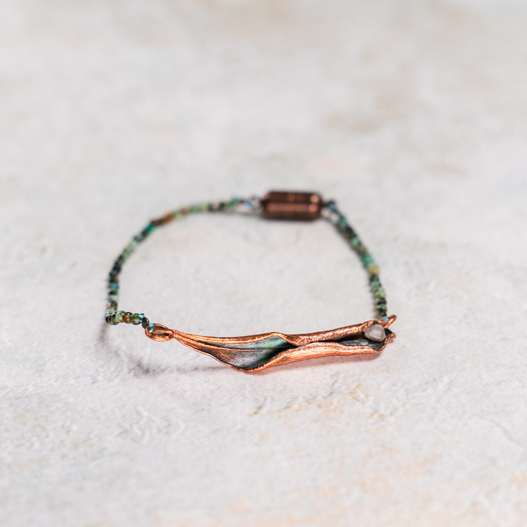 Armband met verkoperd olijfblad uit eigen tuin. In het olijfblad zit een plumosiet kristalletje verwerkt.