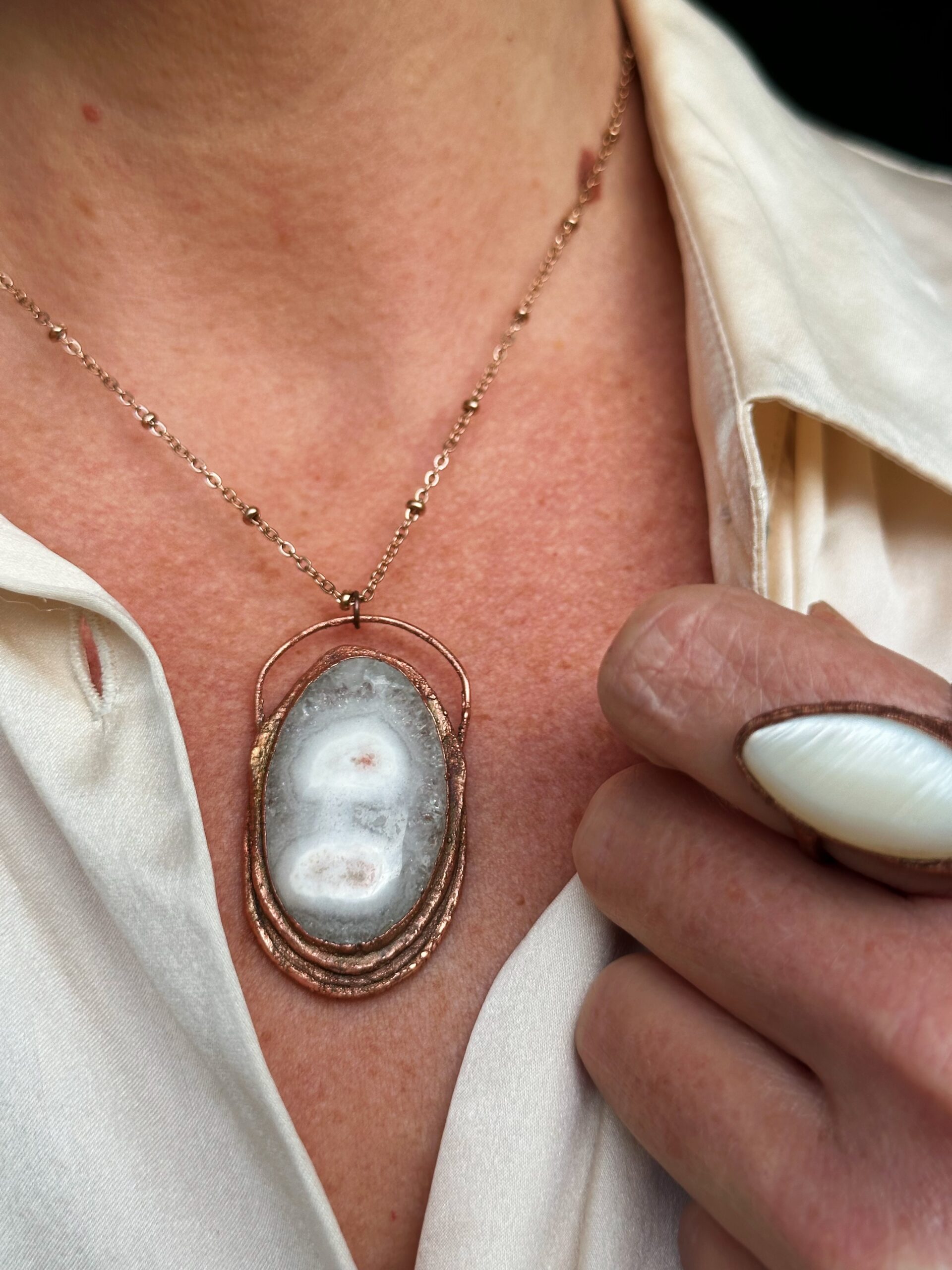 Halsketting met ovale chalcedoon in koper gezet. De hanger is 5cm lang.