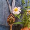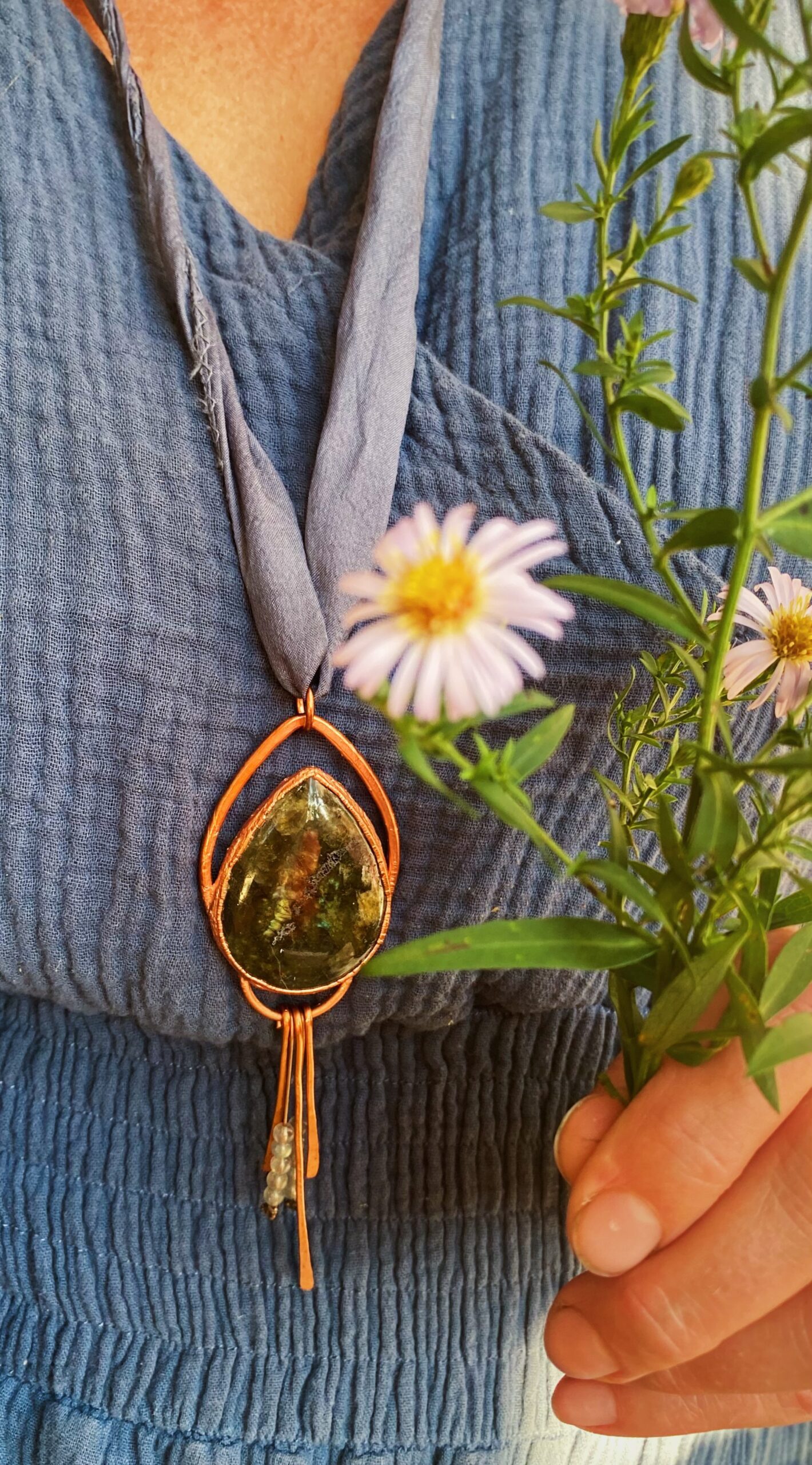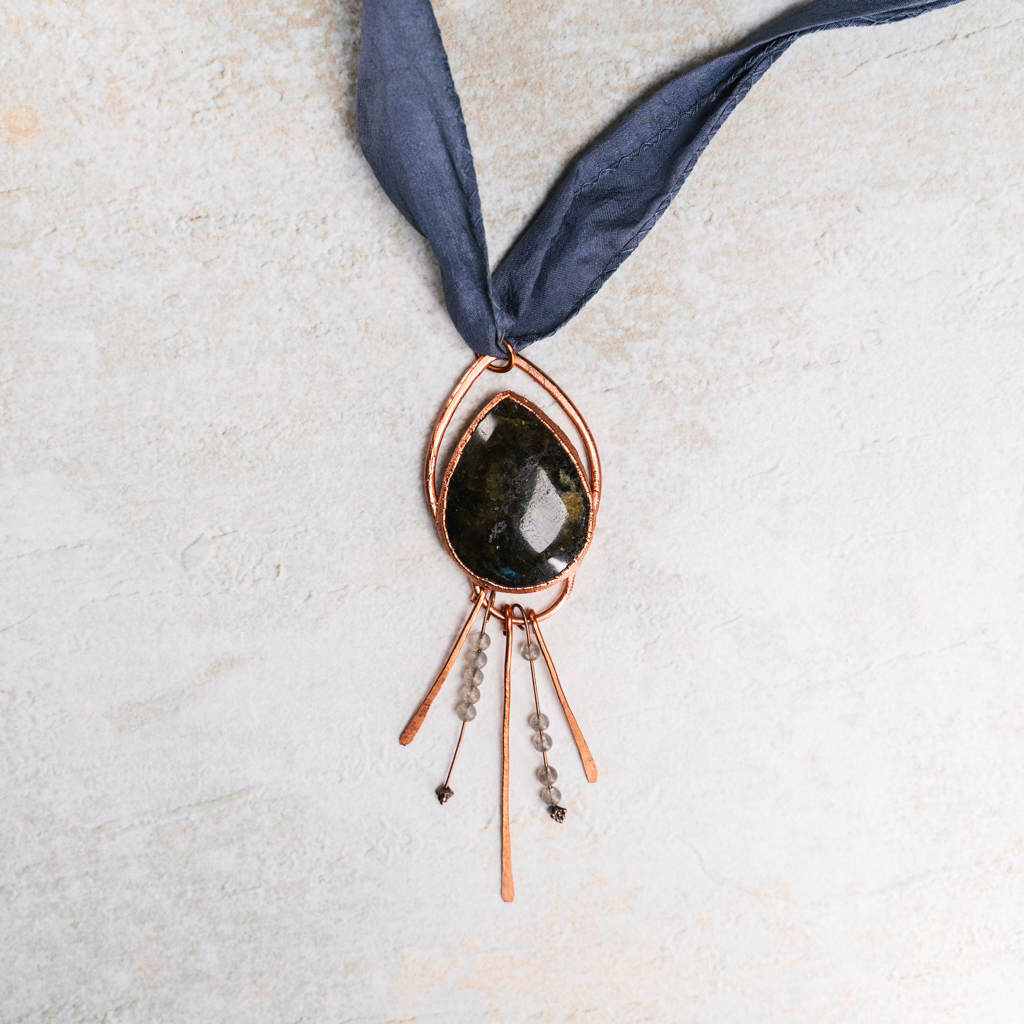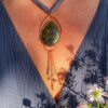 Deze grote hanger is in totaal 12cm lang. De druppelvormige labradoriet is in koper gezet en in de bedels zijn labradoriet kraaltjes verwerkt. De hanger heeft een handgeverfd lint wat in lengte verstelbaar is.