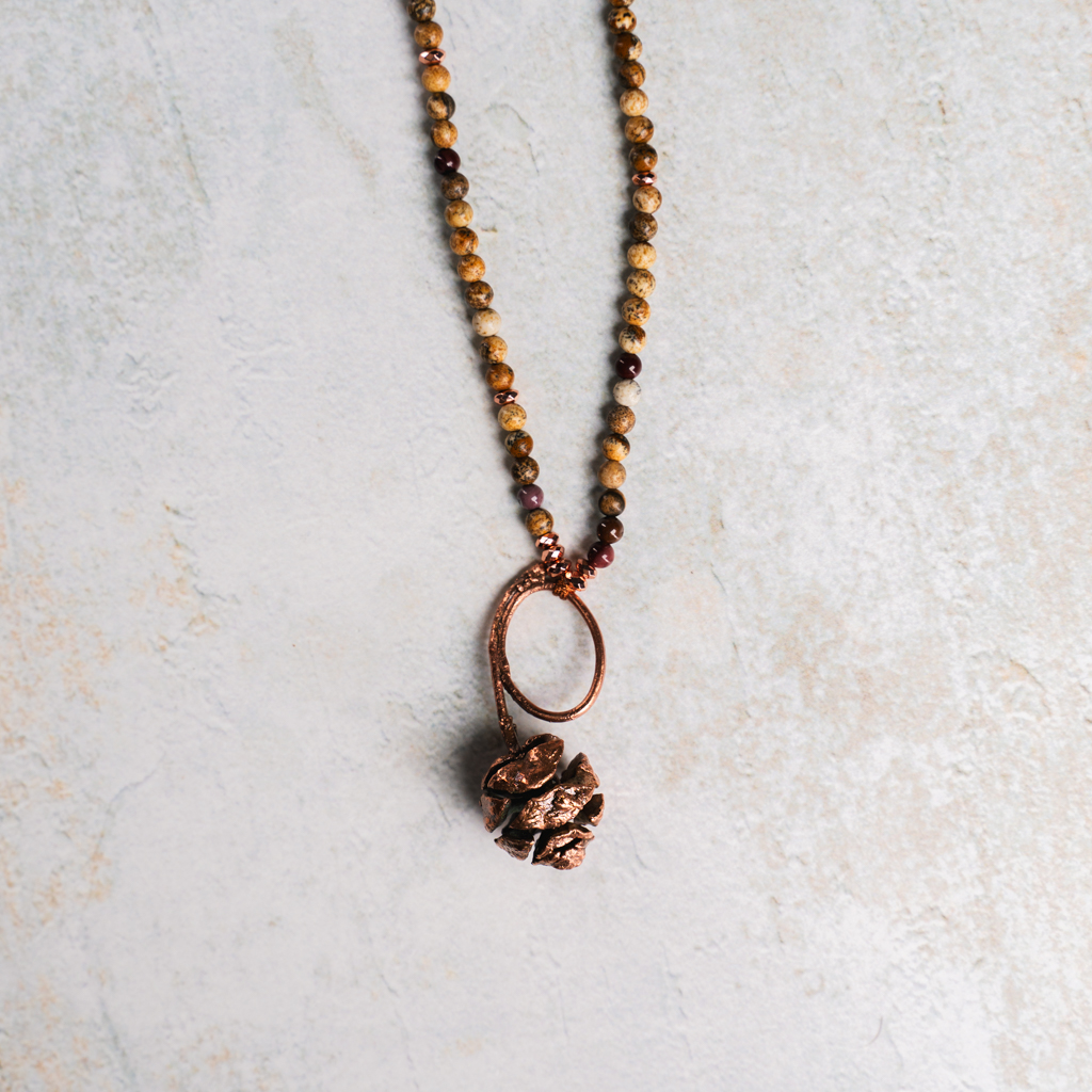 Tags: copper, dennenappel, electroformed, halsketting, hematiet, herfst, jasper, jaspis, koper, mookaiet, necklace, pinecone
