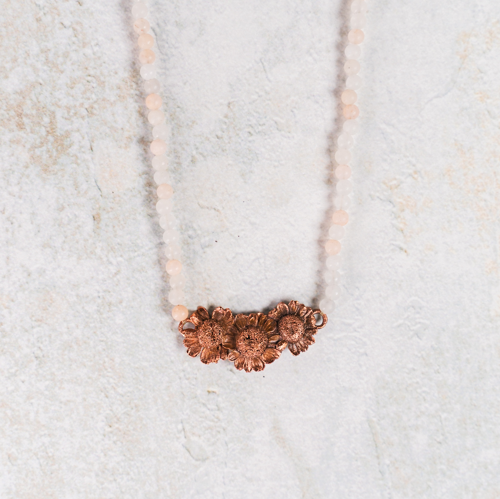 Halsketting met verkoperde moederkruidbloemetjes. Het kettinkje is gemaakt van witte agaat en chalcedoon kralen.