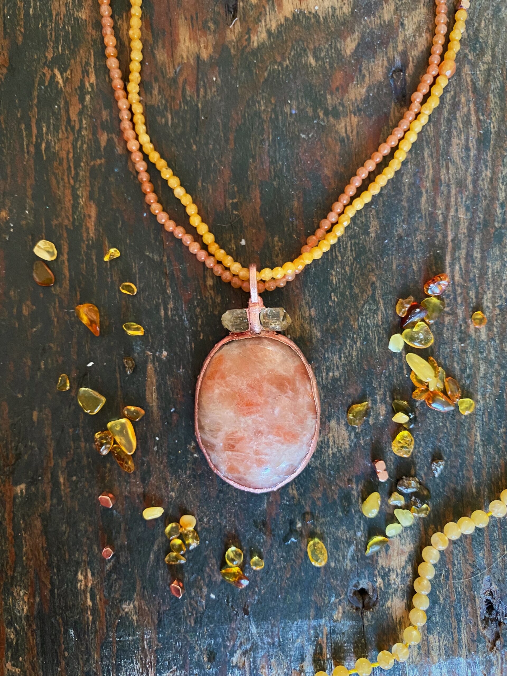 De hanger is een zonnesteen met goudtopaas in koper gezet en is 4,5cm lang.
