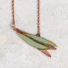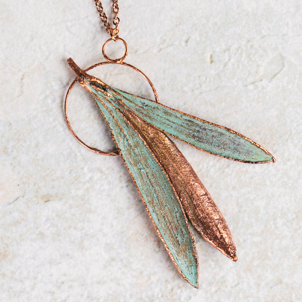 Halsketting met hanger van verkoperd olijfblad. Een deel heeft een groene patina gekregen. De hanger is in totaal 7,5cm lang. Het rose goudkleurige kettinkje is lood- en nikkelvrij en 44cm lang.