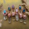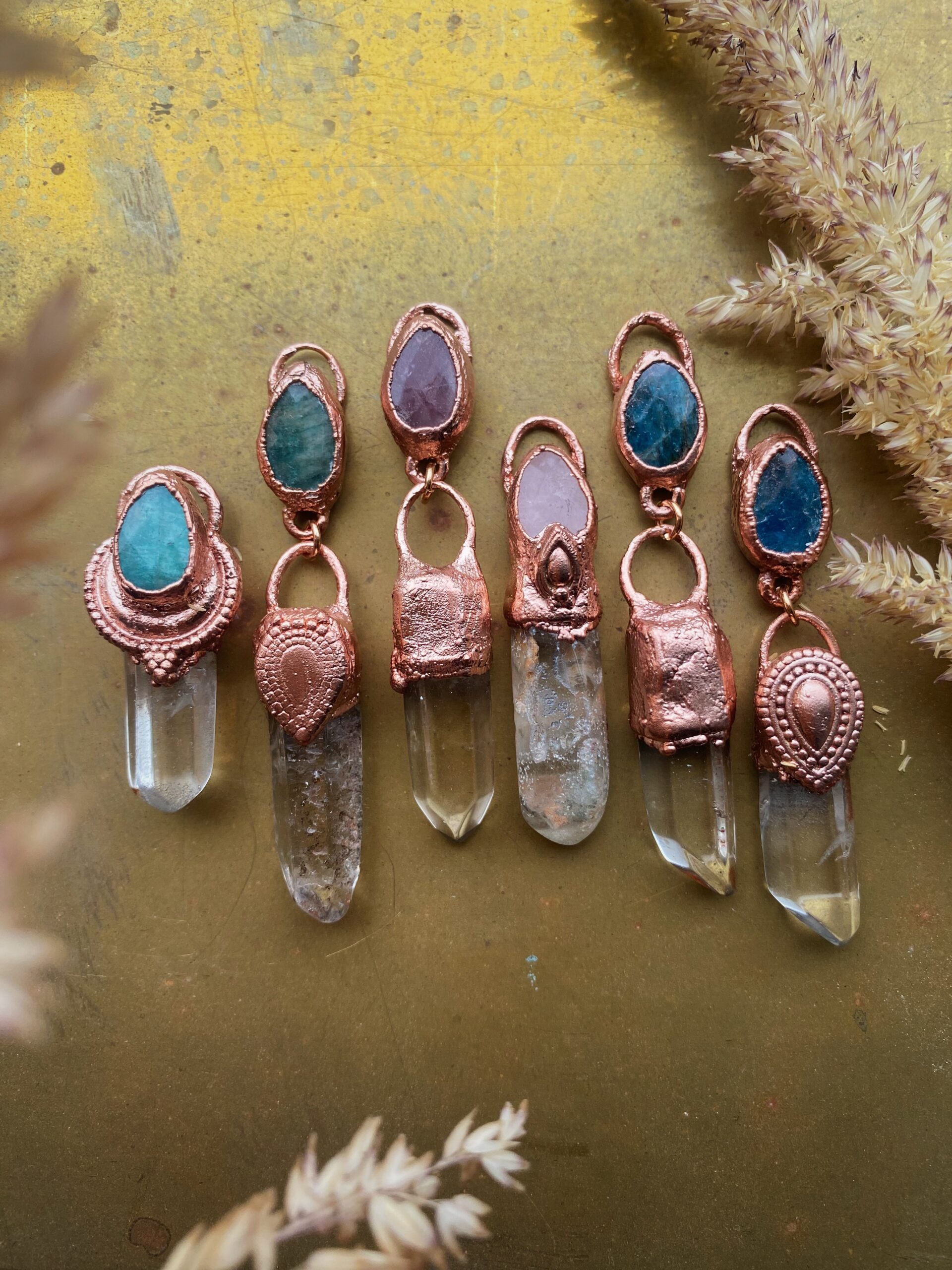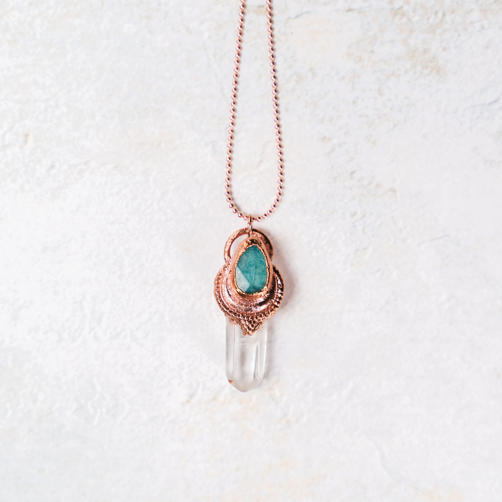 Deze hanger bestaat uit een facet geslepen amazoniet met daaronder een gedecoreerde lodolietpunt. De hanger is in totaal 6cm lang. Het kettinkje is een rose goud kleurige ballchain, lood en nikkelvrij en is 50cm lang.