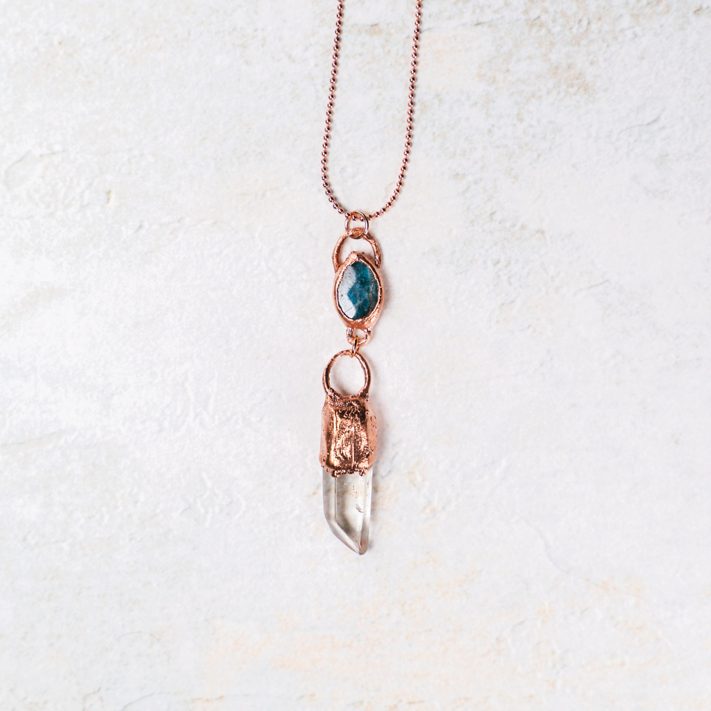 Deze hanger bestaat uit een facet geslepen blauwe apatiet met daaronder een heldere lodolietpunt. De hanger is in totaal 6cm lang. Het kettinkje is een rose goud kleurige ballchain, lood en nikkelvrij en is 50cm lang.