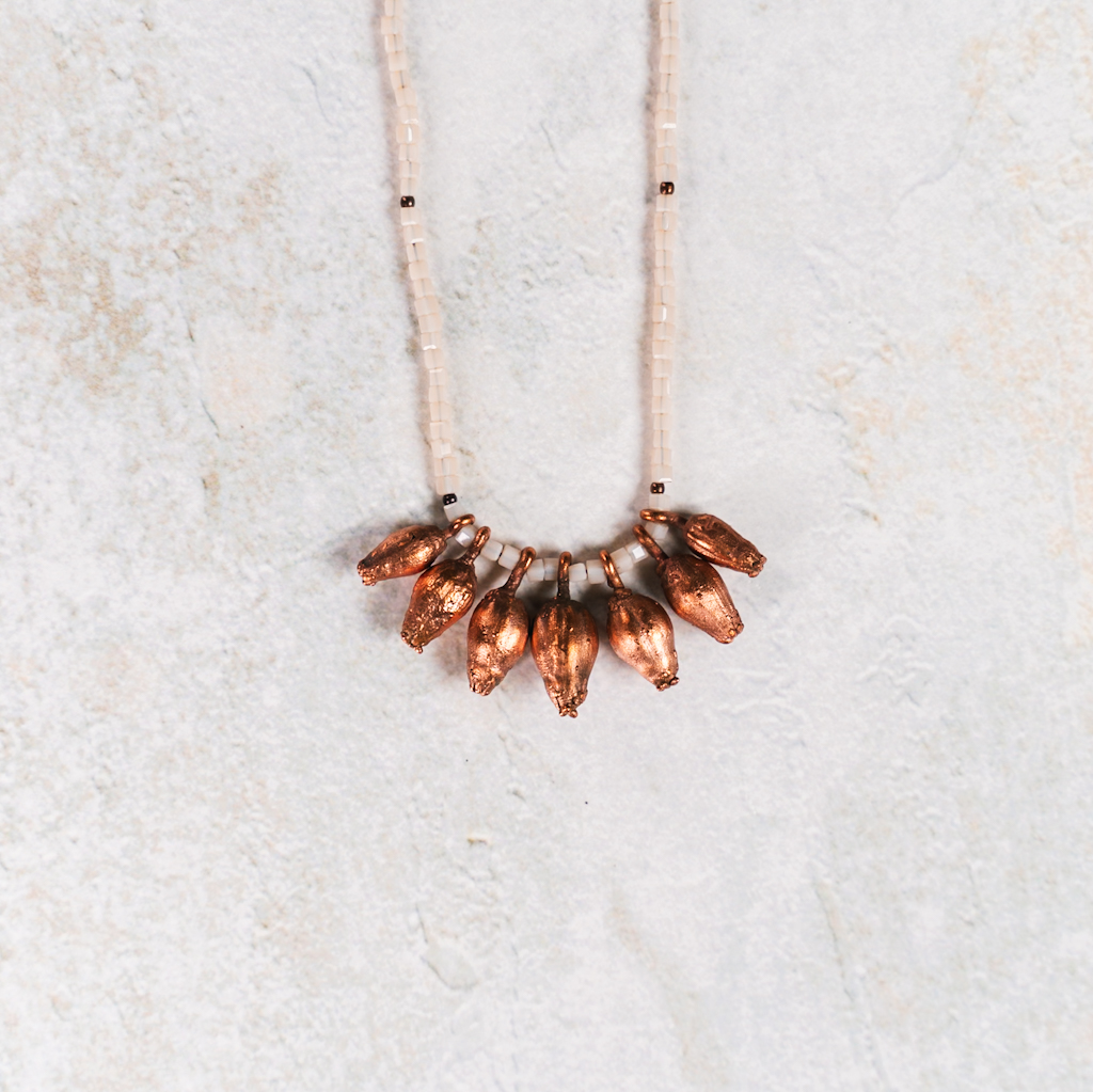 Tags: copper, creme, electroformed, halsketting, koper, necklace, prikneus, seedpods, soft white, zaaddoosje