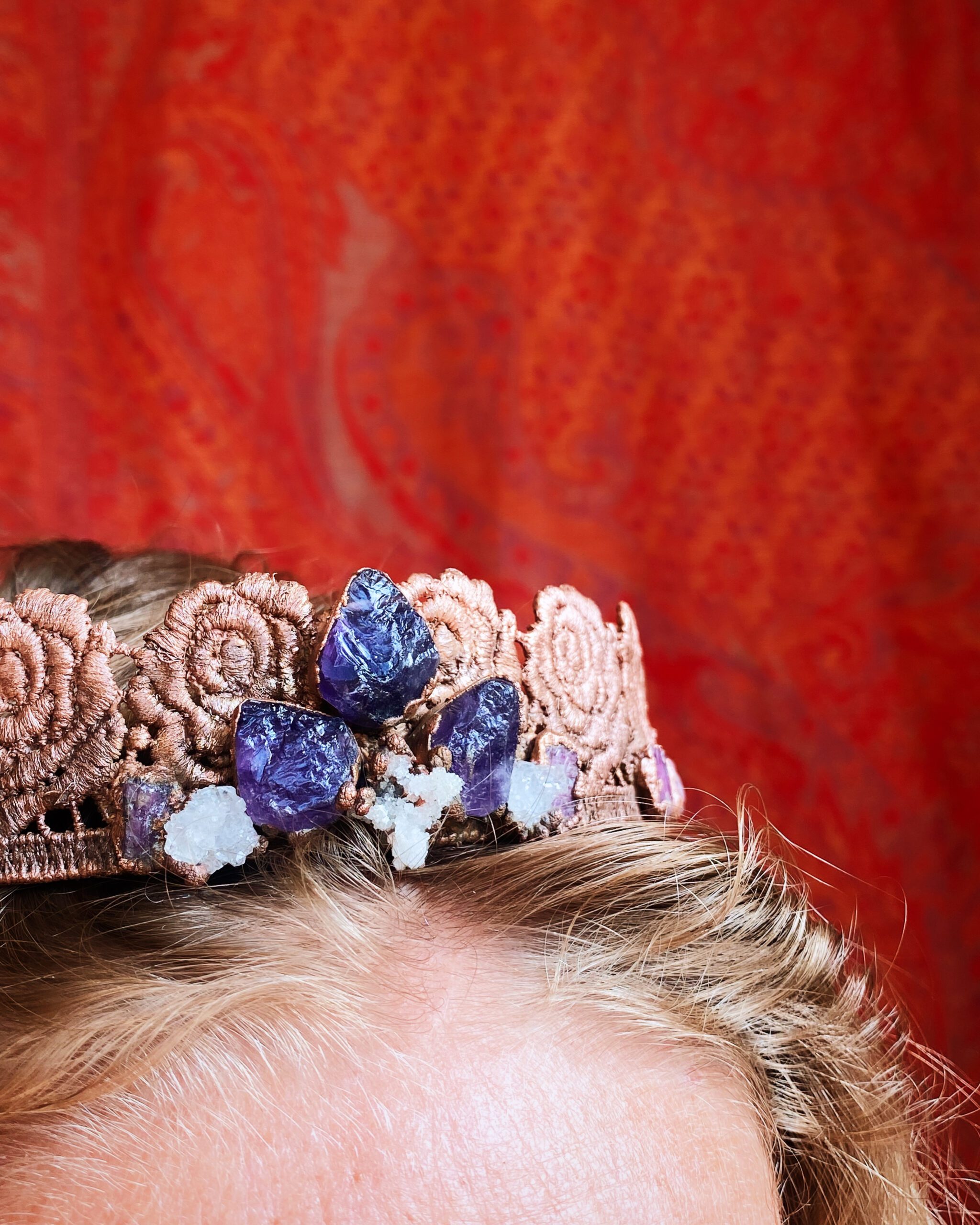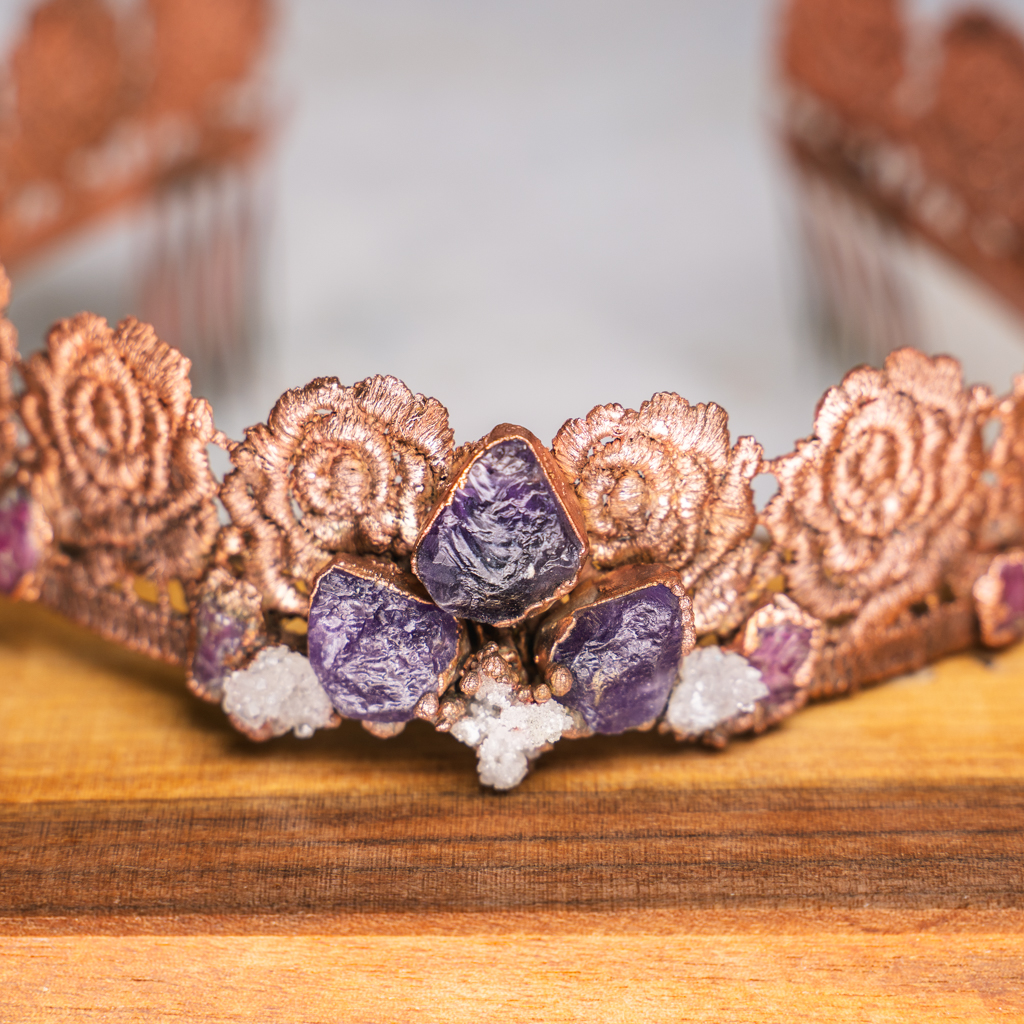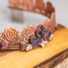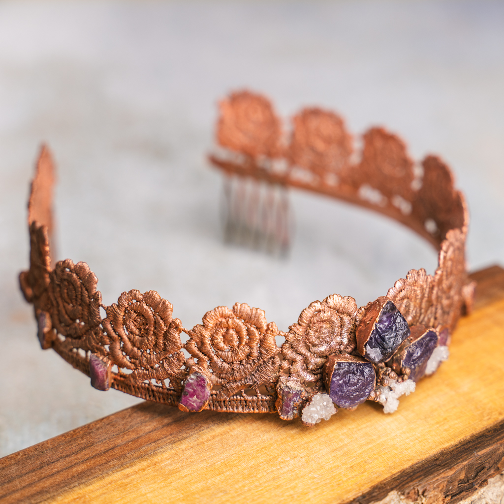 Deze kroon is gemaakt van verkoperd kant. Daarin zijn amethist, bergkristal en robijnen verwerkt.