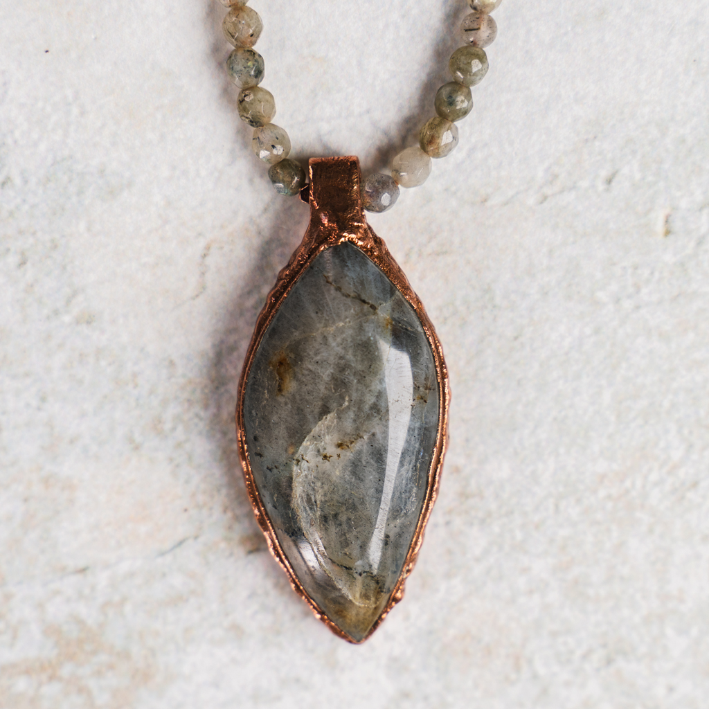 Halsketting van grijsblauwe labradoriet. De met de hand geregen ketting bestaat uit labradoriet en hematiet kralen en is 46cm lang. De hanger is een labradoriet in koper gezet met open achterkant van 5,5cm lang