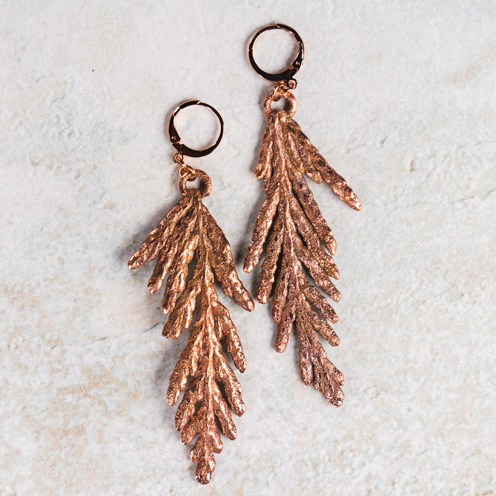 Oorbellen van verkoperde conifeer takjes van 7cm lang.
