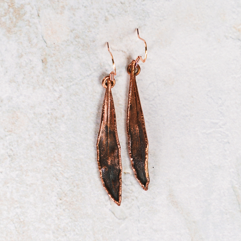 Oorbellen van verkoperd olijfblad. De bladeren zijn deels gepatineerd.