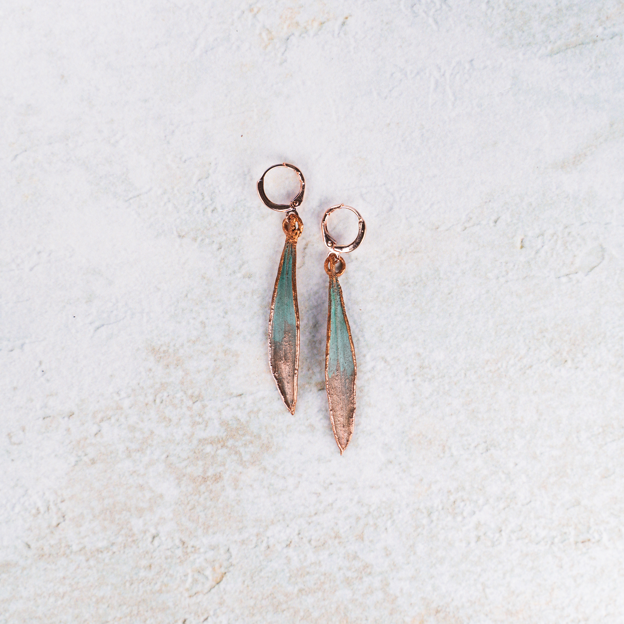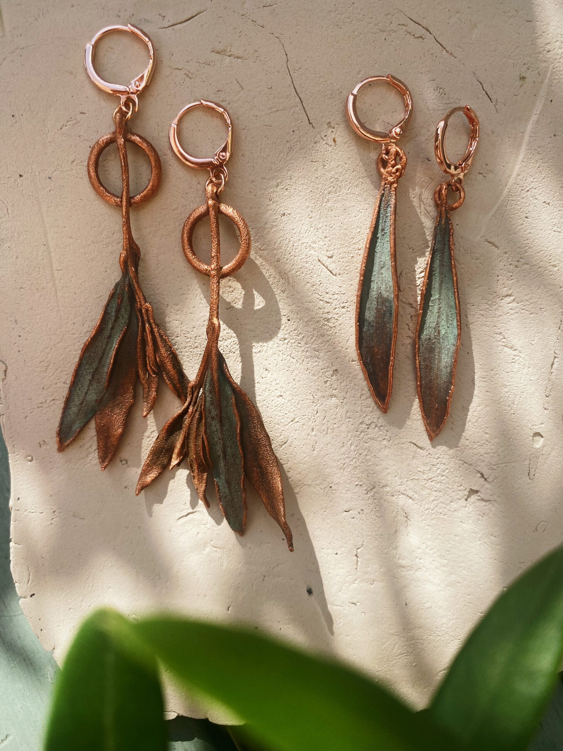De rosé goudkleurige oorringetjes zijn nikkel en lood vrij. De hangers zijn verkoperd blad van de olijfboom uit eigen tuin.