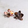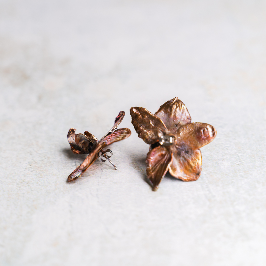 Oorbellen van echte verkoperde orchidee bloemen. De bloemen zijn ongeveer 4cm breed en hebben een vuurpatina ondergaan waardoor het koper verschillende kleuren heeft gekregen.