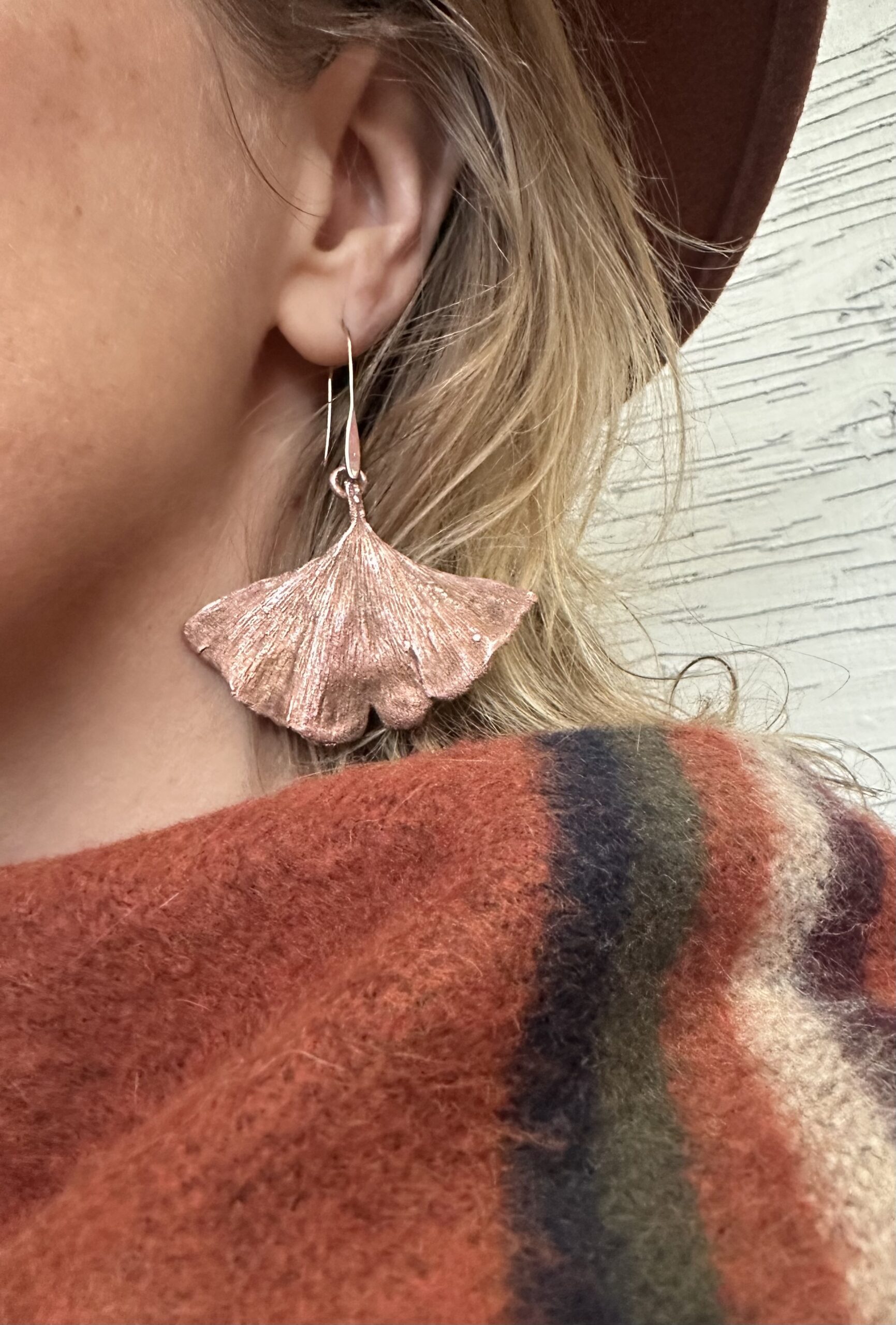 Oorbellen van verkoperde ginkgo bladeren. De rose goud kleurige oorhaakjes zijn lood- en nikkelvrij.