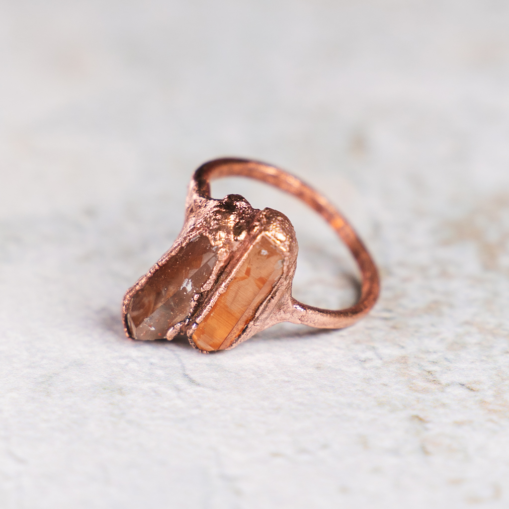 Ring met twee golden healer kristal puntjes in koper gezet.