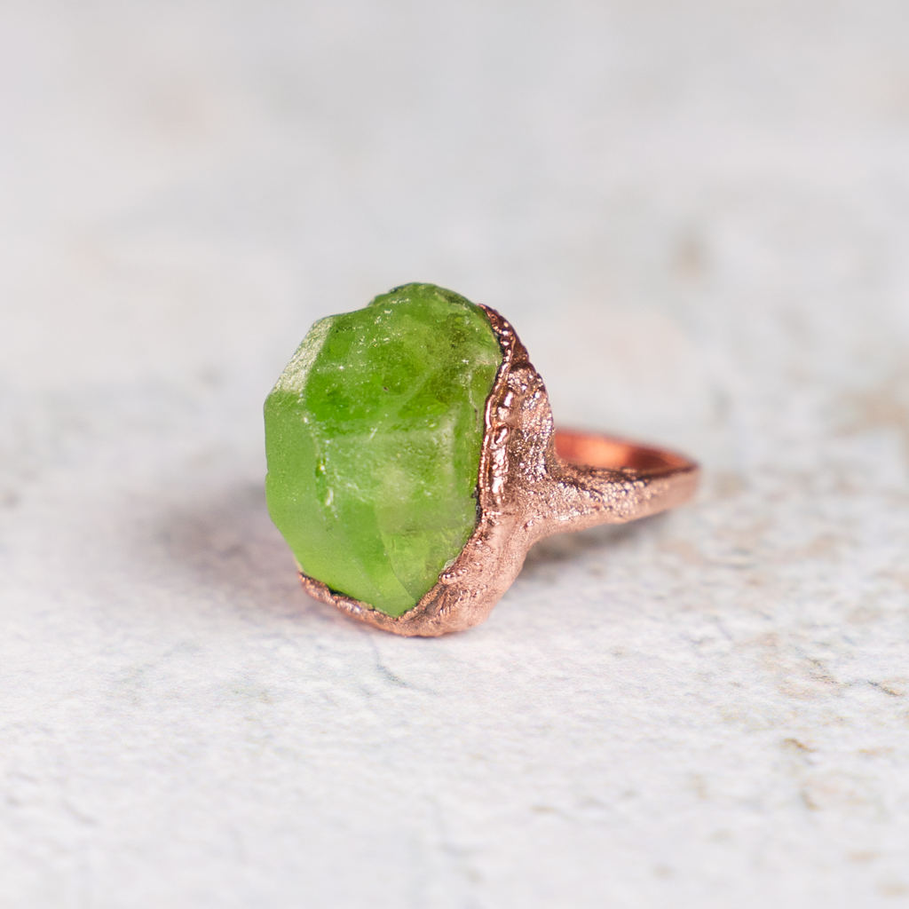 Ring met ruwe forsteriet in koper gezet. De glasachtige steen is helder groen.