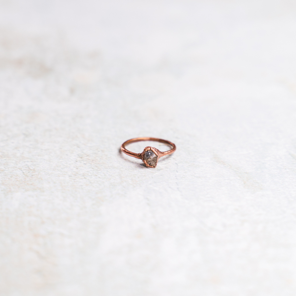 Ring met ruwe herkimer diamant in koper gezet. De steen is transparant met zwarte insluitingen.