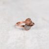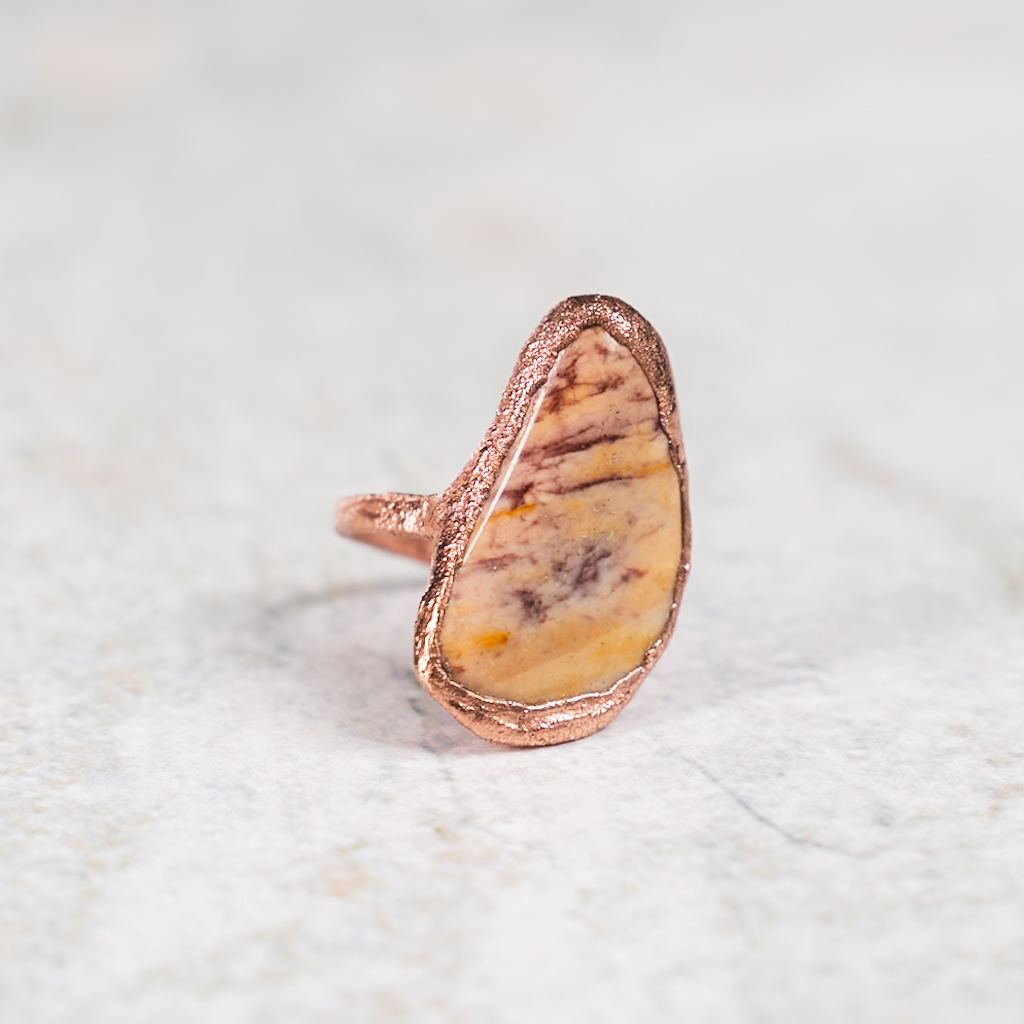 Ring met getrommelde mookaiet steen in koper gezet. De steen heeft oker, bruine en aubergine kleurvlakken.