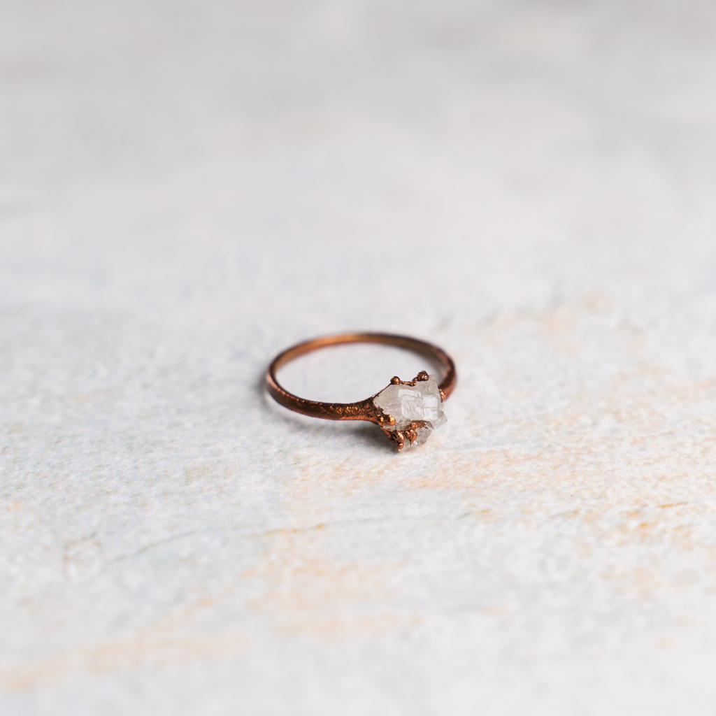 Ring met kleine cluster plumsiet in kwarts in koper gezet.