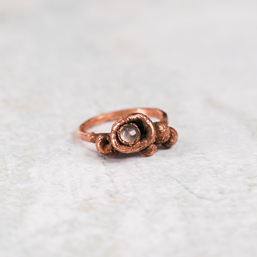 Tags: copper, electroformed, koper, maat 16, ring, rosequartz, rozenkwarts