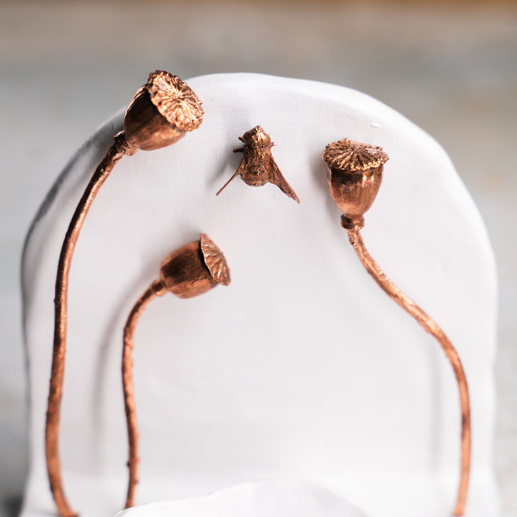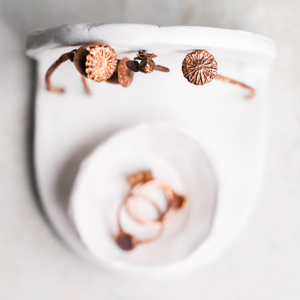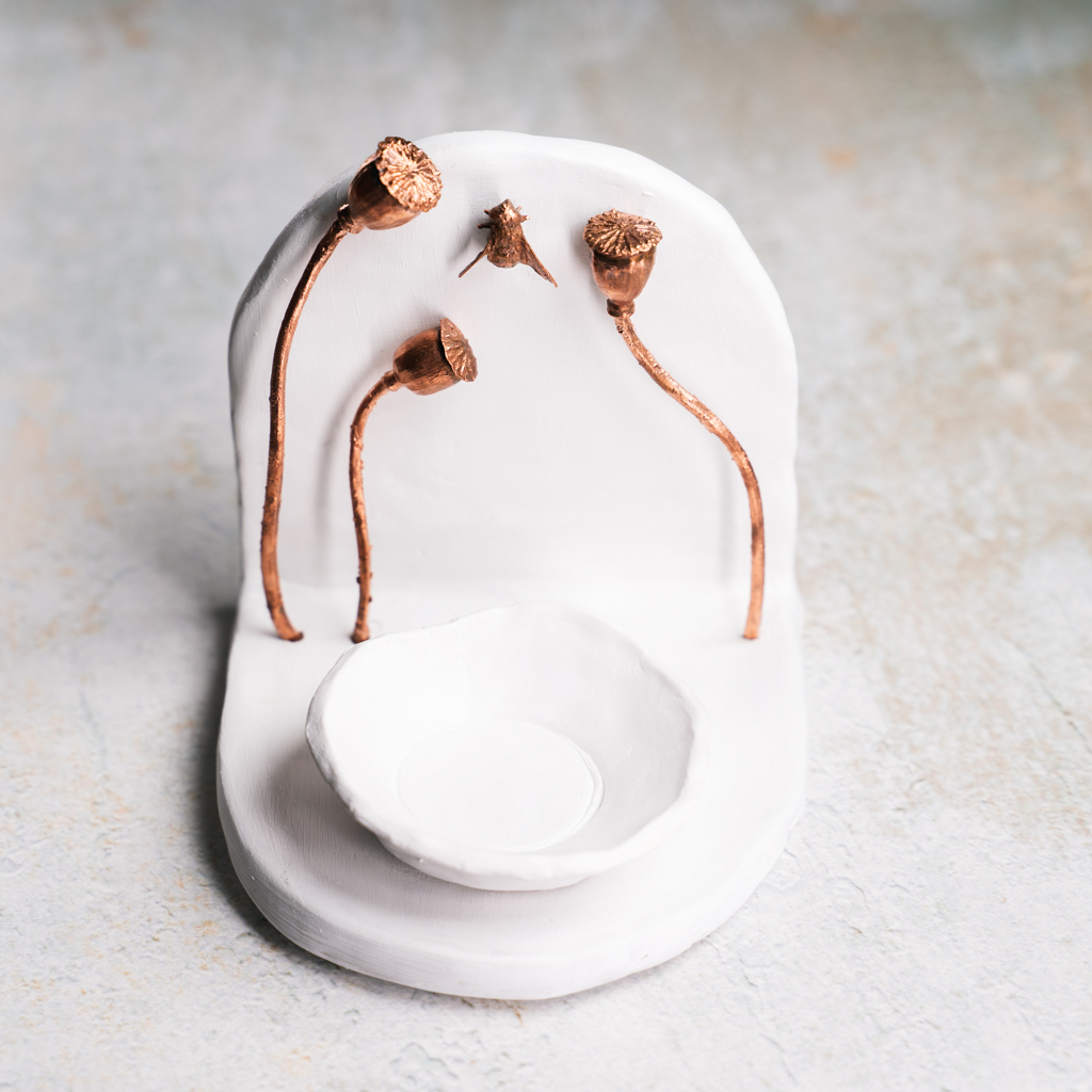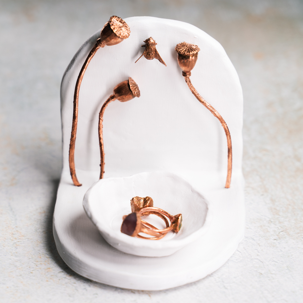 Dit schaaltje is o.a. geschikt voor (waxine)kaarsjes en als sieradenbakje. De koperen elementen zijn verkoperde klaproos zaaddoosjes en een echte bij.